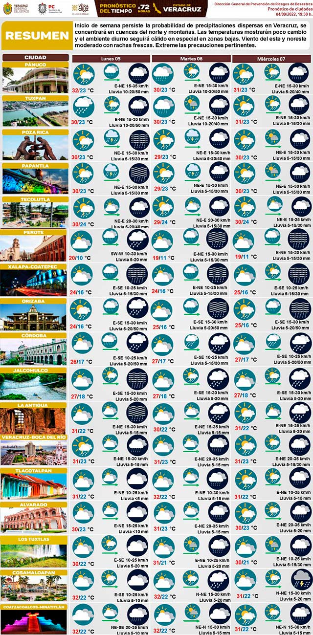 Al inicio de semana persiste la probabilidad de precipitaciones dispersas en Veracruz; se concentrará en cuencas del norte y montañas. El ambiente diurno seguirá cálido en especial en zonas bajas. Viento del Este y Noreste moderado con rachas. Extreme precauciones.