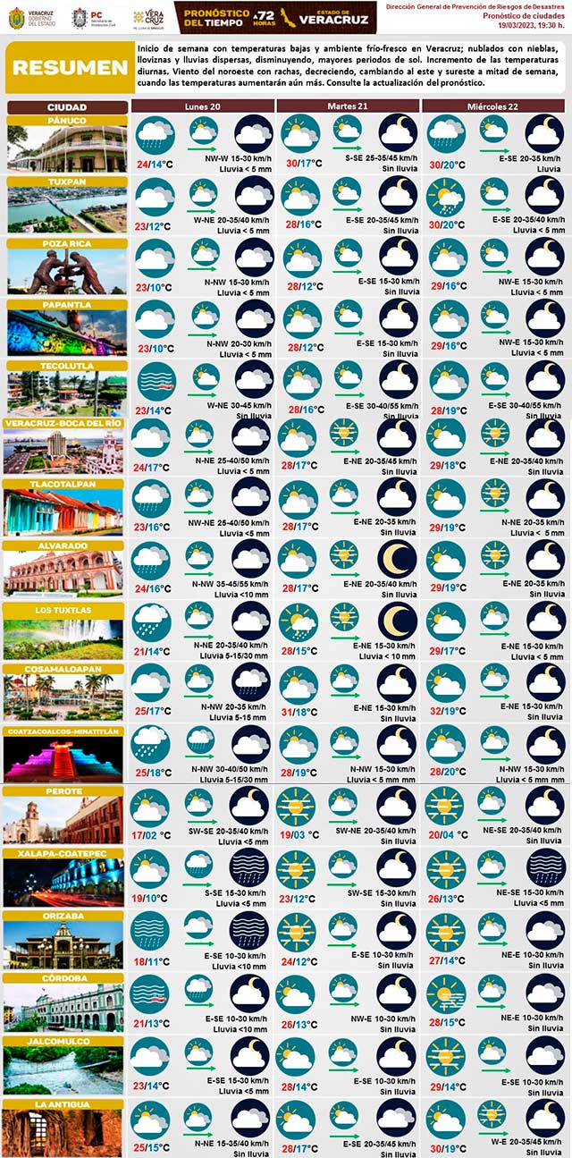 Inicio de semana con temperaturas bajas y ambiente frío-fresco en Veracruz; nublados con nieblas, lloviznas y lluvias dispersas que irán disminuyendo. Mayores periodos de Sol e incremento de las temperaturas diurnas. Viento del noroeste con rachas cambiando al este y sureste a mitad de semana cuando las temperaturas aumentarán aún más.
