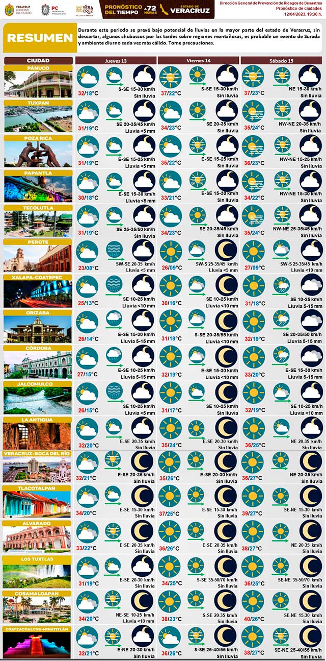 Durante este periodo se prevé bajo potencial de lluvias en la mayor parte de Veracruz, sin descartar algunos chubascos por las tardes sobre regiones montañosas; es probable surada y ambiente diurno cada vez más cálido. Tome precauciones.
