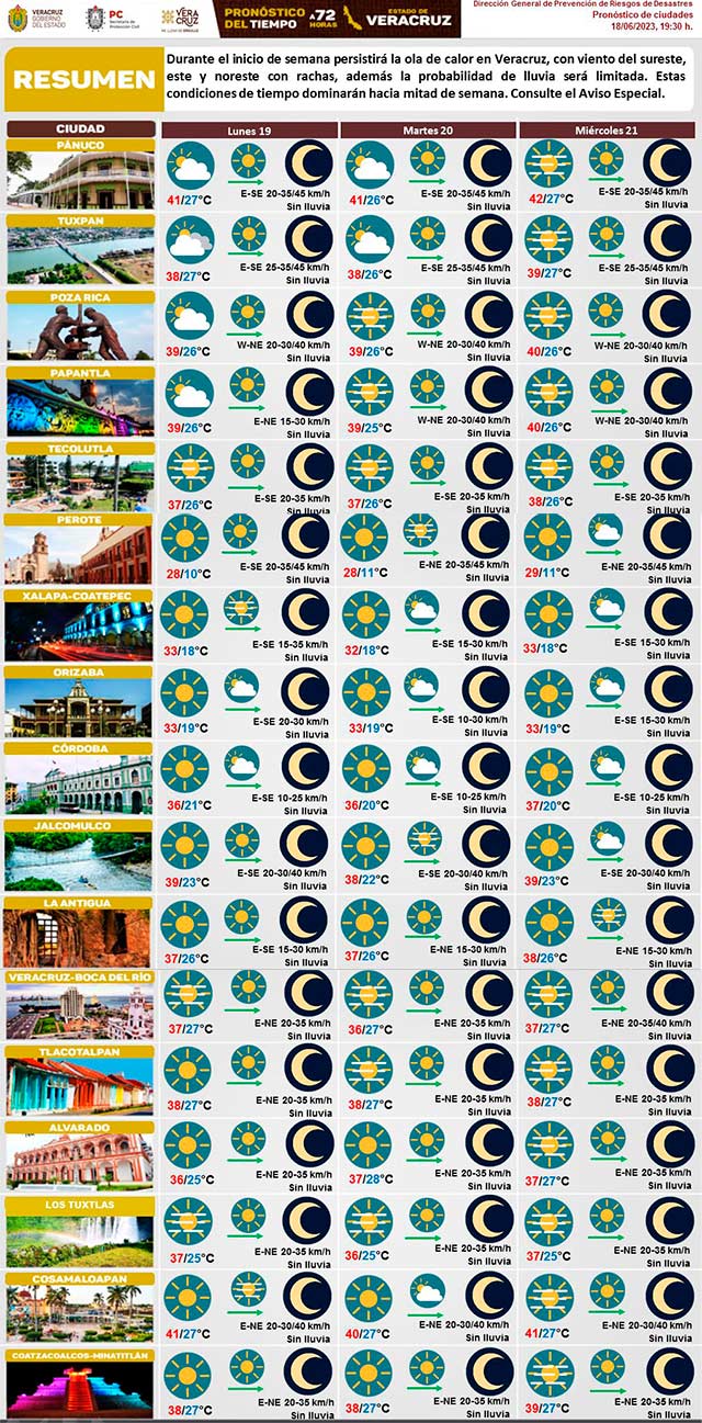 Durante el inicio de semana persistirá la ola de calor en Veracruz, con viento del sureste, este y noreste con rachas, además la probabilidad de lluvia será limitada. Estas condiciones de tiempo dominarán hacia mitad de semana. Consulte el Aviso Especial