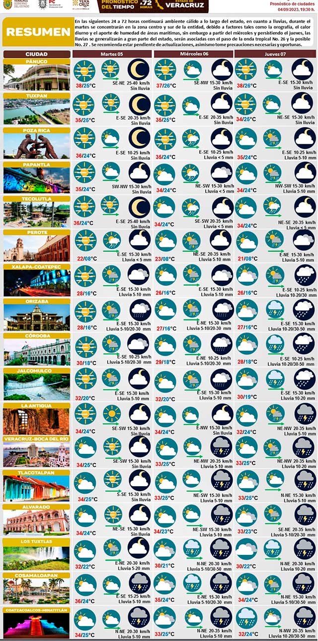 En las siguientes 24 a 72 horas continuará ambiente cálido en el Estado, en cuanto a lluvias. Este martes se concentrarán en la zona centro y sur debido a la orografía, el calor diurno y el aporte de humedad de áreas marítimas. A partir del miércoles y persistiendo el jueves, las lluvias se generalizarán en gran parte del Estado por la onda tropical 26 y la posible 27.