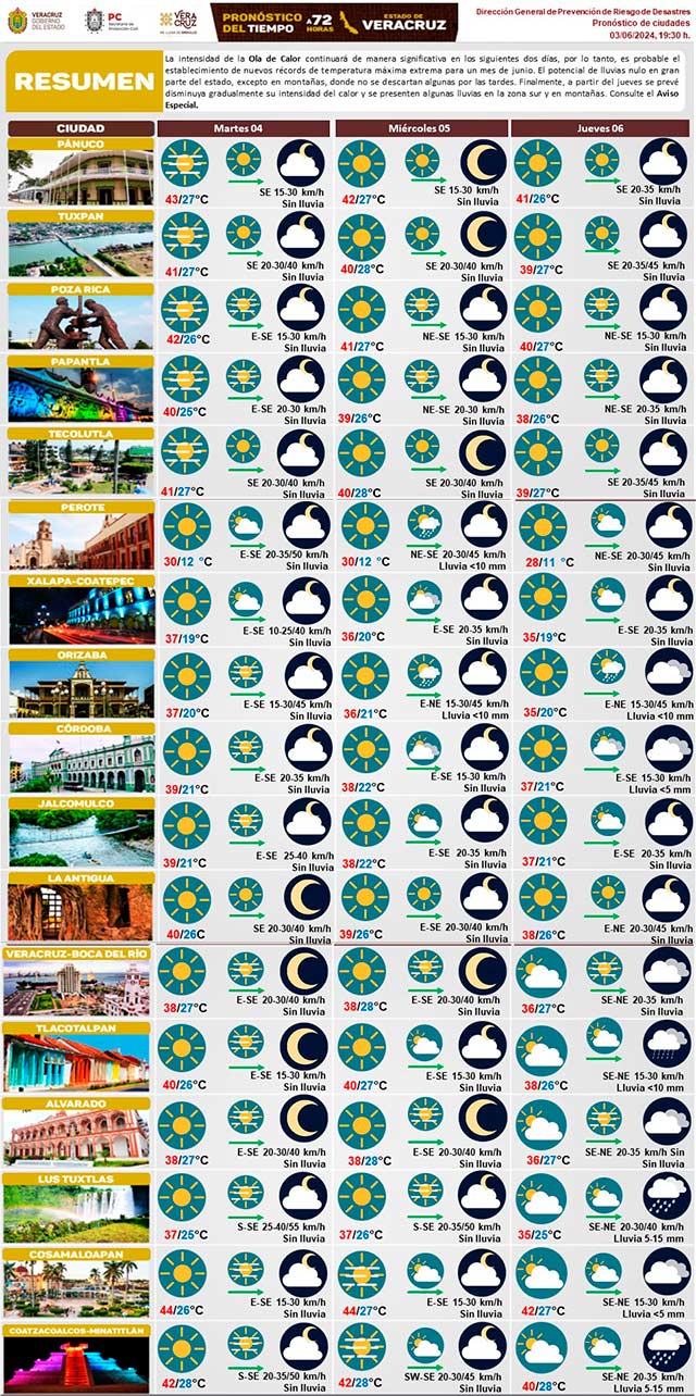 Intensidad de la ola de calor continuará en siguientes 2 días; son probables nuevos récords de temperaturas máximas extrema para un mes de junio. Potencial de lluvias nulo excepto en montañas, donde no se descartan algunas por las tardes. A partir del jueves podría disminuir gradualmente la intensidad del calor y llovería en zona sur y montañas.