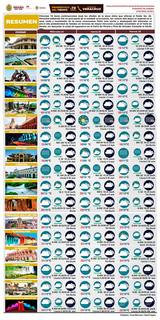 Próximas 72 horas persistirá ambiente frío en gran parte de la entidad; los valores más bajos se esperan en la zona norte y localidades de la sierra veracruzana. En la madrugada del miércoles se prevén heladas en terrenos de mayor elevación y posible cencellada en el Valle de Perote sin descartar caída de aguanieve en el Cofre de Perote y Pico de Orizaba.