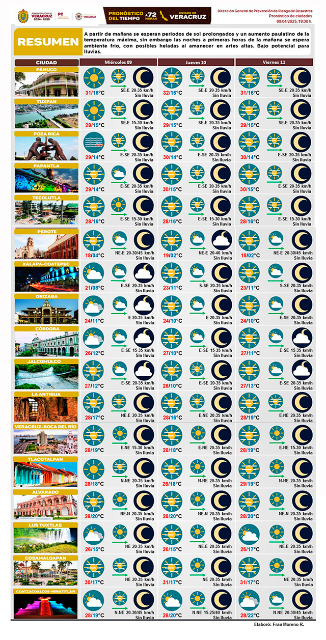 A partir de mañana se esperan periodos de sol prolongados y aumento paulatino de la temperatura máxima; noches a primeras horas de la mañana se espera ambiente frío, con posibles heladas al amanecer en partes altas. Bajo potencial de lluvias.