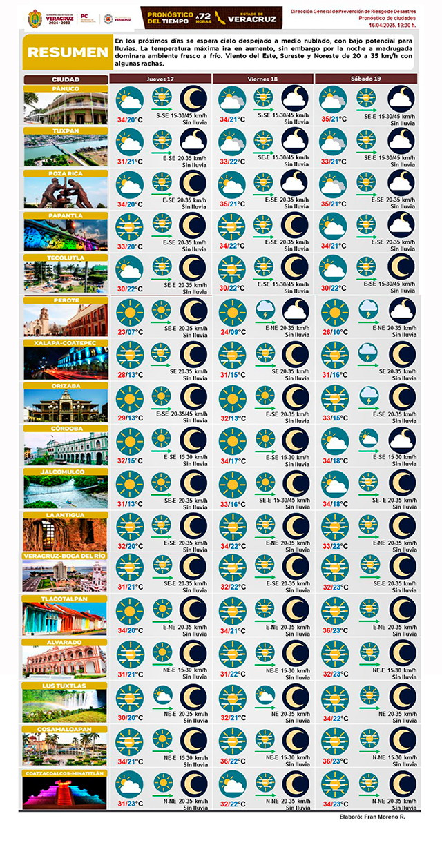 En los próximos días se espera cielo despejado a medio nublado, con bajo potencial para lluvias. La temperatura máxima irá en aumento. Sin embargo, por la noche a madrugada dominará ambiente fresco a frío. Viento del este, sureste y noreste de 20 a 35 kilómetros por hora con algunas rachas.