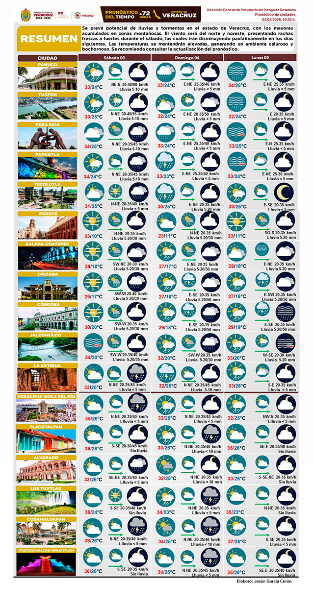 Se prevé potencial de lluvias y tormentas en Veracruz, con los mayores acumulados en zonas montañosas. Viento del norte y noreste con rachas frescas a fuertes este sábado, que irán disminuyendo en días siguientes. Temperaturas se mantendrán elevadas, generando ambiente caluroso y bochornoso. Consulte actualizaciones del tiempo.