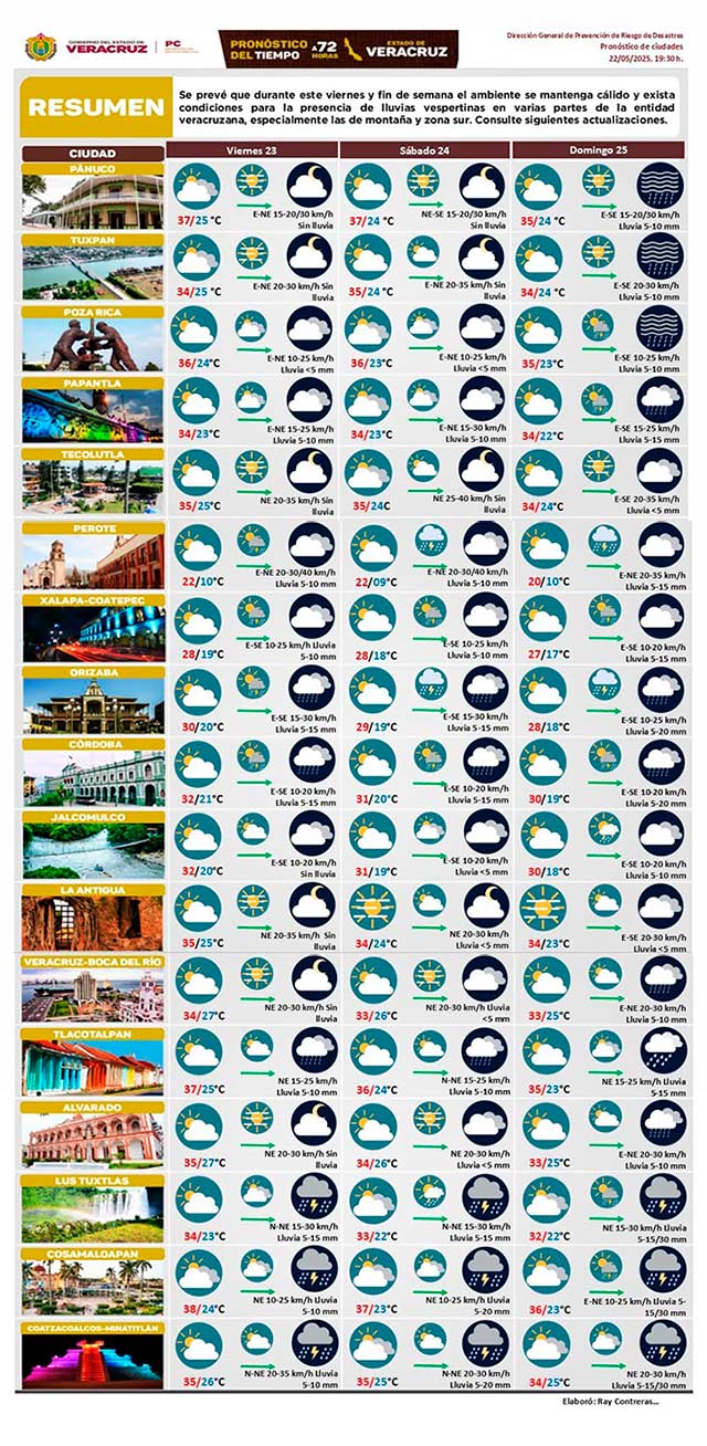 Se prevé que durante este viernes y fin de semana el ambiente se mantenga cálido y existan condiciones para la presencia de lluvias vespertinas en varias partes de la entidad veracruzana, especialmente las de montaña y zona sur. Consulte siguientes actualizaciones.