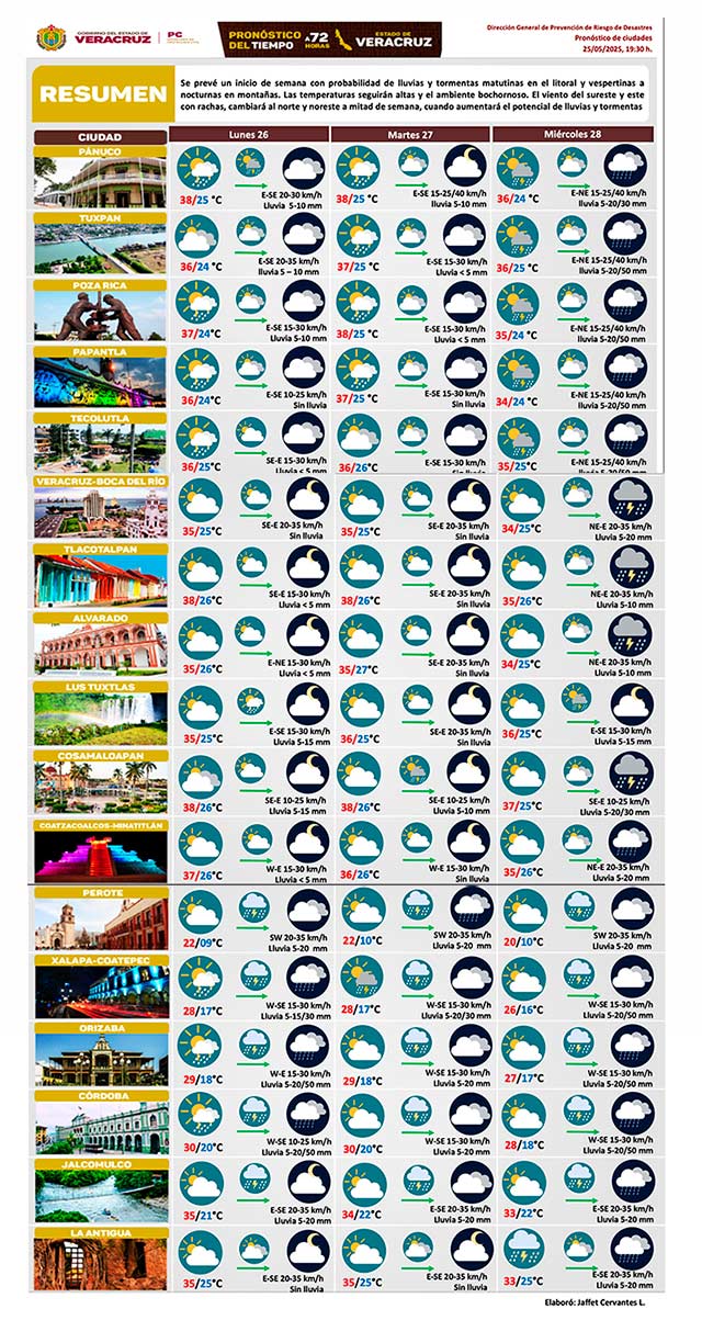Se prevé inicio de semana con probabilidad de lluvias matutinas en el litoral y vespertinas a nocturnas en montaña. Temperaturas seguirán altas y ambiente bochornoso. Viento del sureste y este con rachas, cambiará al norte y noreste a mitad de semana, cuando aumentará el potencial de lluvias y tormentas.