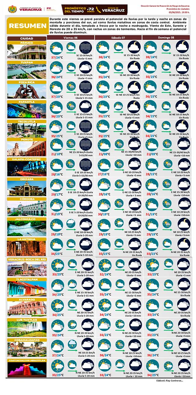 Viernes persistirá potencial de lluvias por la tarde y noche en montañas y porciones del sur, así como lluvias matutinas en zonas de costa central. Ambiente cálido en el día, templado a fresco por la noche a madrugada. Viento de 20 a 35 kilómetros por hora con rachas en zonas de tormenta. Hacia el fin de semana el potencial de lluvias puede disminuir.