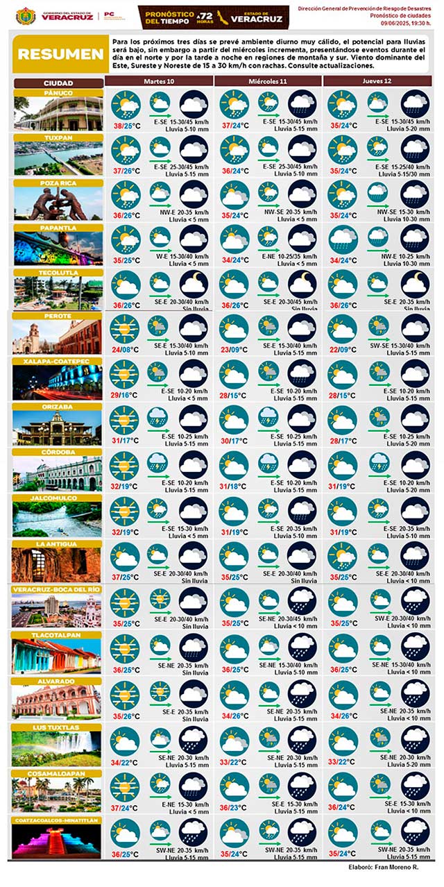 Para los próximos 3 días ambiente diurno muy cálido, potencial para lluvias bajo; a partir del miércoles incrementa presentándose eventos durante el día en el norte y por la tarde a noche en regiones de montaña y sur. Viento del este, sureste y noreste de 15 a 30 kilómetros por hora con rachas. Consulte actualizaciones.
