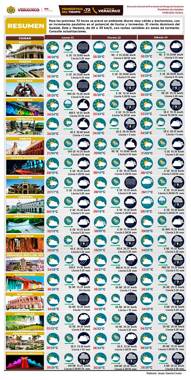Para las próximas 72 horas se prevé un ambiente diurno muy cálido y bochornoso, con un incremento paulatino en el potencial de lluvias y tormentas. El viento dominará del sureste, este y noreste, de 20 a 35 kilómetros por hora, con rachas variables en zonas de tormenta. Consulte actualizaciones.