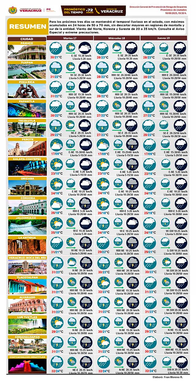 Para los próximos 3 días se mantendrá el temporal lluvioso en el estado, con máximos acumulados en 24 horas de 50 a 70 milímetros, sin descartar mayores en regiones de montaña y sur de la entidad. Viento del norte, noreste y sureste de 20 a 35 kilómetros por hora. Consulte la Alerta Gris y extreme precauciones.