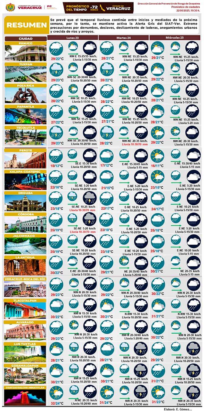 Se prevé que el temporal lluvioso continúa entre inicios y mediados de la próxima semana, por lo tanto, se mantiene activa la Alerta Gris del SIAT-Ver. Extreme precauciones por derrumbes, deslaves, deslizamientos de laderas, anegamientos urbanos y crecida de ríos y arroyos.