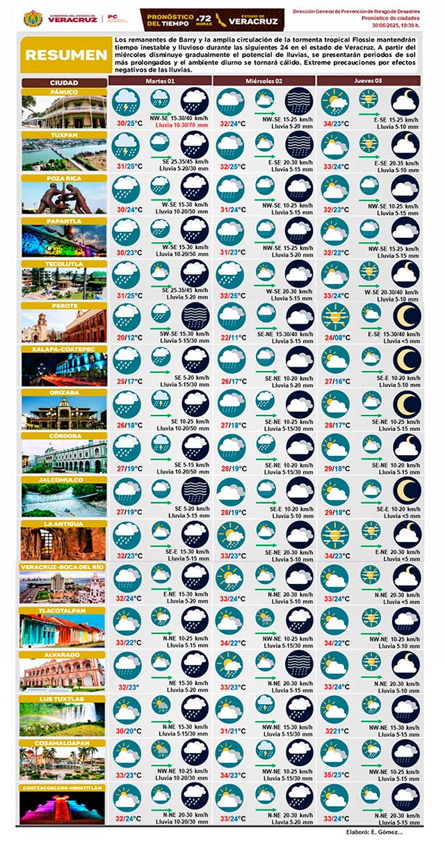 Los remanentes de Barry y la amplia circulación de la tormenta tropical Flossie mantendrán tiempo inestable y lluvioso durante las siguientes 24 horas en Veracruz. A partir del miércoles disminuye gradualmente potencial de lluvias, habrá periodos de sol más prolongados y el ambiente diurno será cálido. Extreme precauciones por efectos negativos de las lluvias.