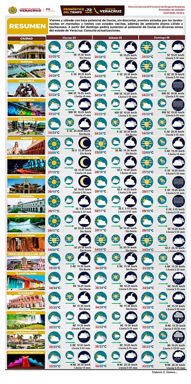 Viernes y sábado con bajo potencial de lluvias, sin descartar eventos aislados por las tardes-noches en montañas y límites con estados vecinos, además de ambiente diurno cálido y bochornoso. A partir del domingo podría aumentar potencial de lluvias en varias zonas del Estado. Consulte actualizaciones.