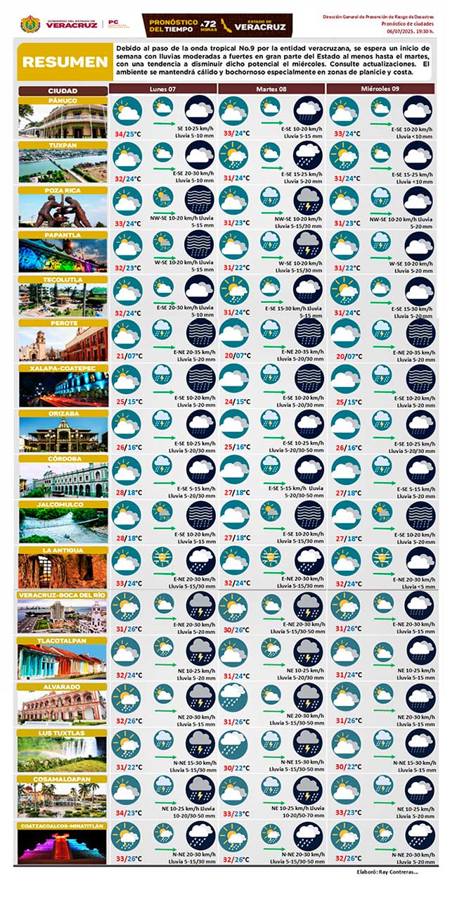 Debido al paso de la onda tropical 9 por la entidad, se espera un inicio de semana con lluvias moderadas a fuertes en gran parte del Estado al menos hasta el martes, con una tendencia a disminuir el miércoles. Consulte actualizaciones. El ambiente cálido y bochornoso, especialmente en zonas de planicie y costa.