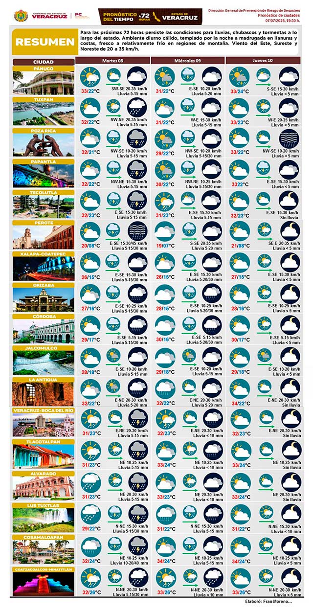 Persisten condiciones para lluvias, chubascos y tormentas a lo largo del Estado. Ambiente diurno cálido, templado por la noche a madrugada en llanuras y costas, frescos a relativamente frío en regiones de montaña. Viento del este, sureste y noreste de 20 a 35 kilómetros por hora.