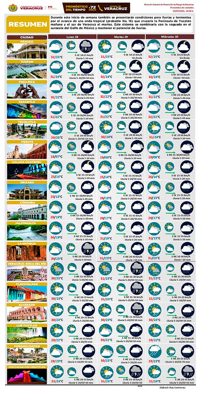 Este inicio de semana se presentarán condiciones para lluvias y tormentas por el avance de una onda tropical (probable número 16) que cruzaría la Península de Yucatán y el sur de Veracruz el martes. Este sistema se combinaría con la vaguada en el suroeste del Golfo de México para mantener el potencial de lluvias.