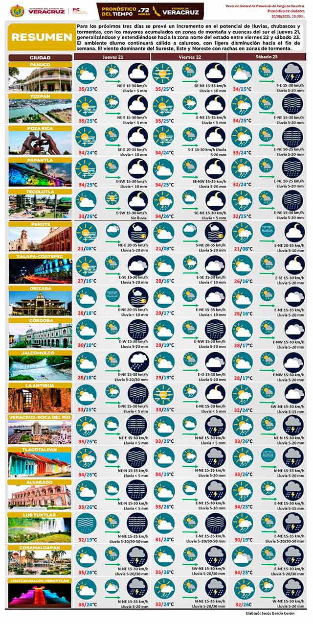 Para los próximos 3 días se prevé incremento del potencial de lluvias, chubascos y tormentas, con los mayores acumulados en zona montañosa y cuencas del sur el jueves 21 y extendiéndose hacia la zona norte del estado entre viernes 22 y sábado 23. El ambiente diurno continuará cálido a caluroso, con ligera disminución hacia el fin de semana.