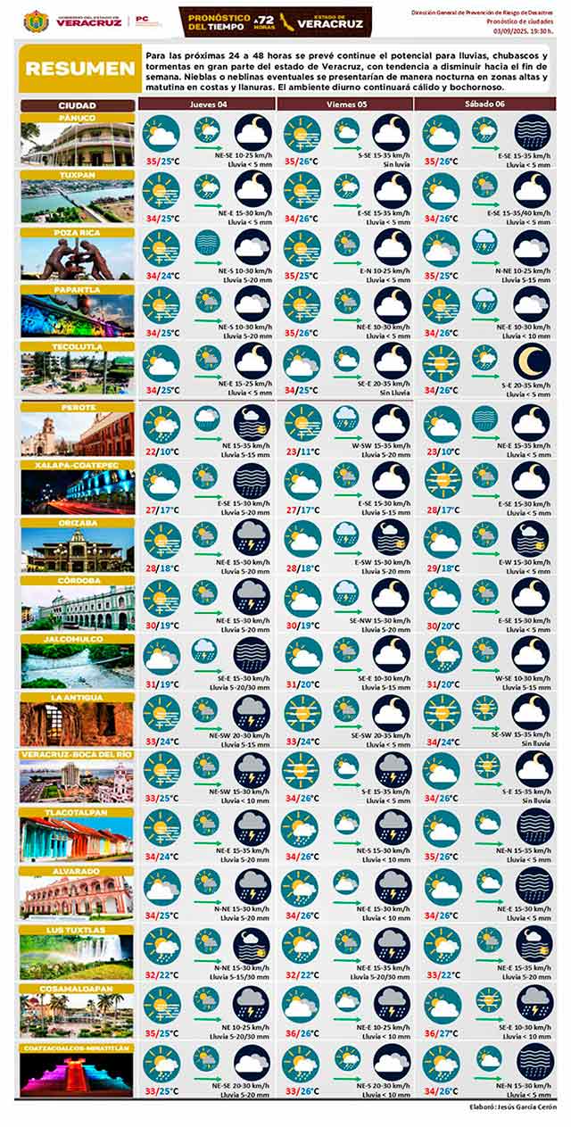 Para las próximas 24 a 48 horas se prevé continue el potencial para lluvias, chubascos y tormentas en gran parte de Veracruz con tendencia a disminuir hacia el fin de semana. Nieblas o neblinas eventuales nocturna en zonas altas, matutinas en costas y llanuras. Ambiente diurno cálido y bochornoso.