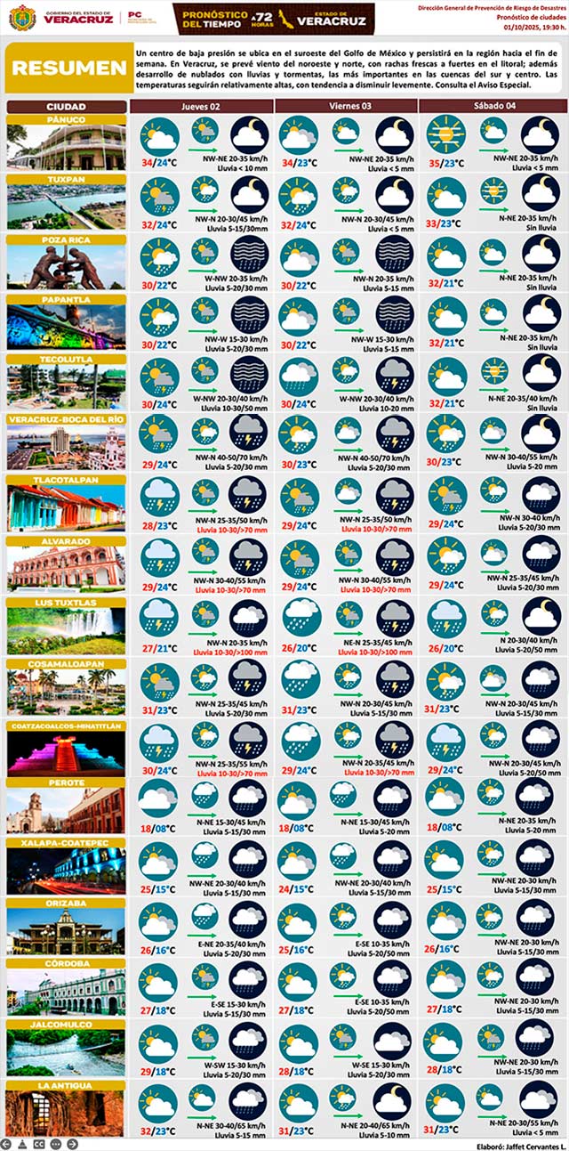 Un centro de baja presión se ubica en el suroeste del Golfo de México que persistirá el fin de semana. En Veracruz, se prevé viento con rachas frescas a fuertes en el litoral; además de nublados con lluvias y tormentas, las más importantes en cuencas del sur y centro. La temperatura seguirá relativamente alta con tendencia a disminuir levemente.