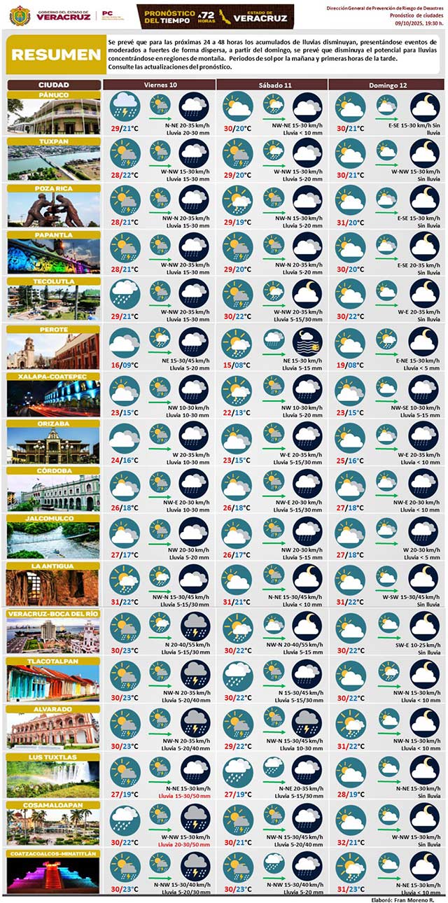 Se prevé que para las próximas 24 a 48 horas los acumulados de lluvias disminuyan, presentándose eventos de moderados a fuertes de forma dispersa, a partir del domingo, se prevé que disminuya el potencial para lluvias concentrándose en regiones de montaña. Periodos de sol por la mañana y primeras horas de la tarde.