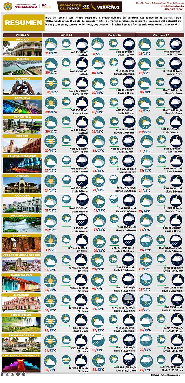 Inicio de semana con tiempo despejado a medio nublado en Veracruz. Las temperaturas diurnas serán relativamente altas. El viento del noreste y este. De martes a miércoles, se prevé el aumento del potencial de lluvias y tormentas, con viento del norte, que desarrollará rachas frescas a fuertes en la costa central. Precaución.