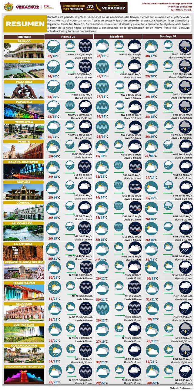 Viernes con aumento en el potencial de lluvias, viento del norte con rachas en costas y ligero descenso de temperatura por aproximación del frente número 18. Dichos efectos disminuirán el sábado y aumentaría nuevamente el potencial de lluvias a partir de la tarde-noche del domingo. Consulte actualizaciones y tome sus precauciones.