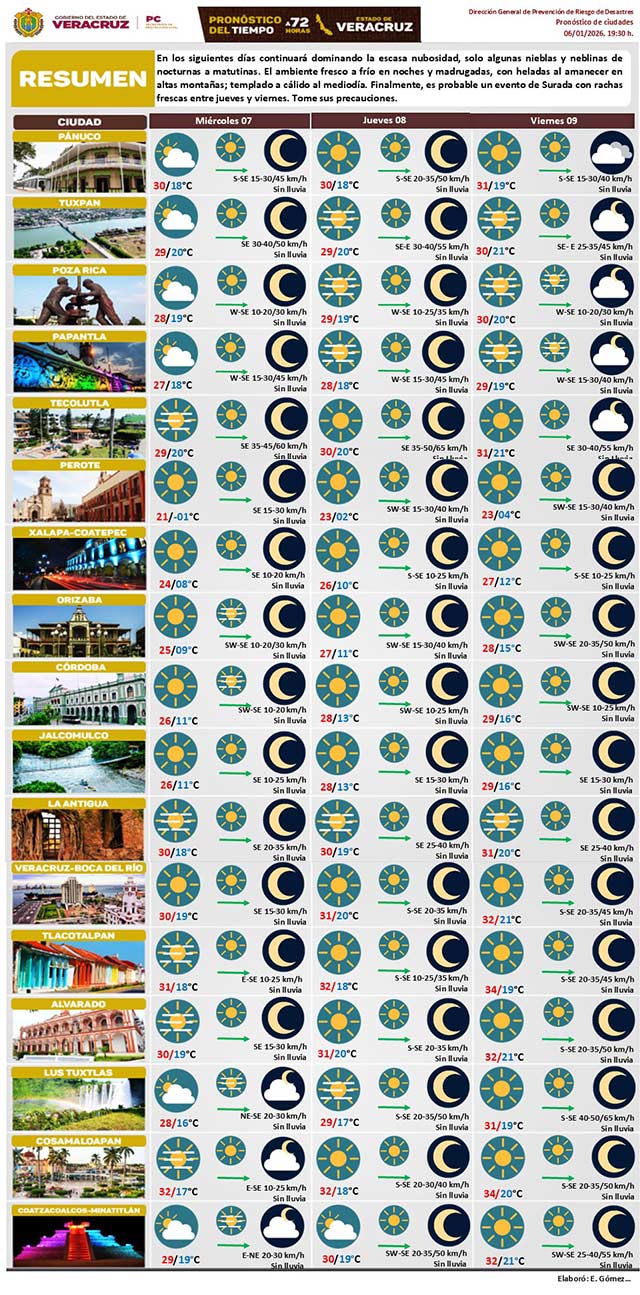 En los siguientes días continuará dominando la escasa nubosidad, sólo algunas nieblas y neblinas de nocturnas a matutinas. El ambiente fresco a frío en noches y madrugadas, con heladas al amanecer en altas montañas; templado a cálido al mediodía. Finalmente, es probable una surada con rachas frescas entre jueves y viernes. Tome sus precauciones.