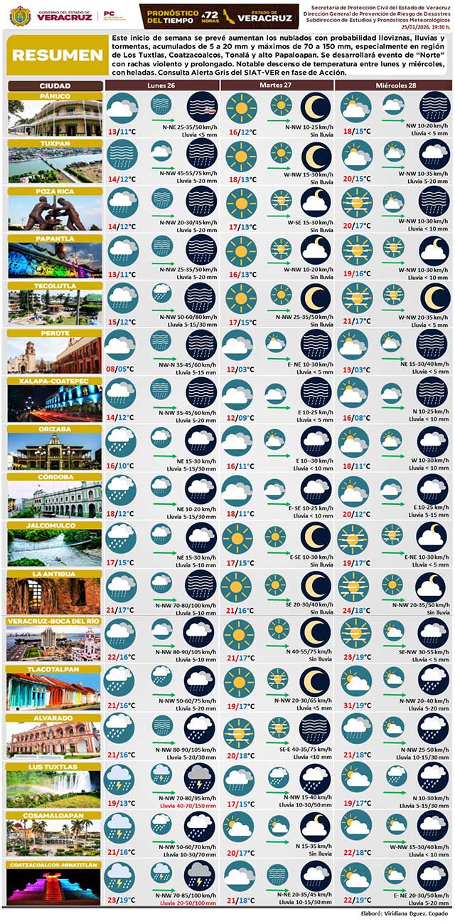 Inicio de semana con aumento de nublados con probabilidad lloviznas, lluvias y tormentas, acumulados máximos de 70 a 150 milímetros, sobre todo en Los Tuxtlas, Coatzacoalcos, Tonalá y alto Papaloapan. “Norte” violento y prolongado. Notable descenso de temperatura entre lunes y miércoles, con heladas. Consulta Alerta Gris del SIAT-VER en fase de Acción.