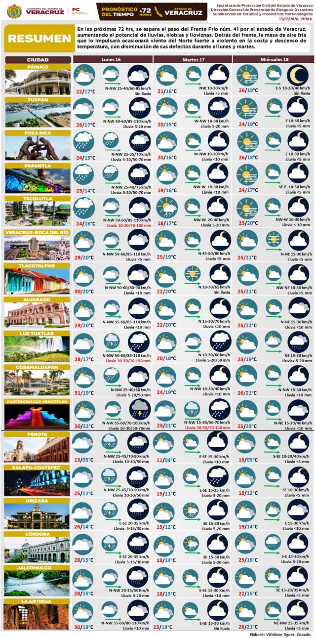 En las próximas 72 horas se espera el paso del Frente Frío núm. 41 por el estado de Veracruz, aumentando el potencial de lluvias, nieblas y lloviznas. Detrás del frente, la masa de aire fría que lo impulsará ocasionará viento del norte fuerte a violento en la costa y descenso de temperatura, con disminución de sus defectos durante el lunes y martes.
