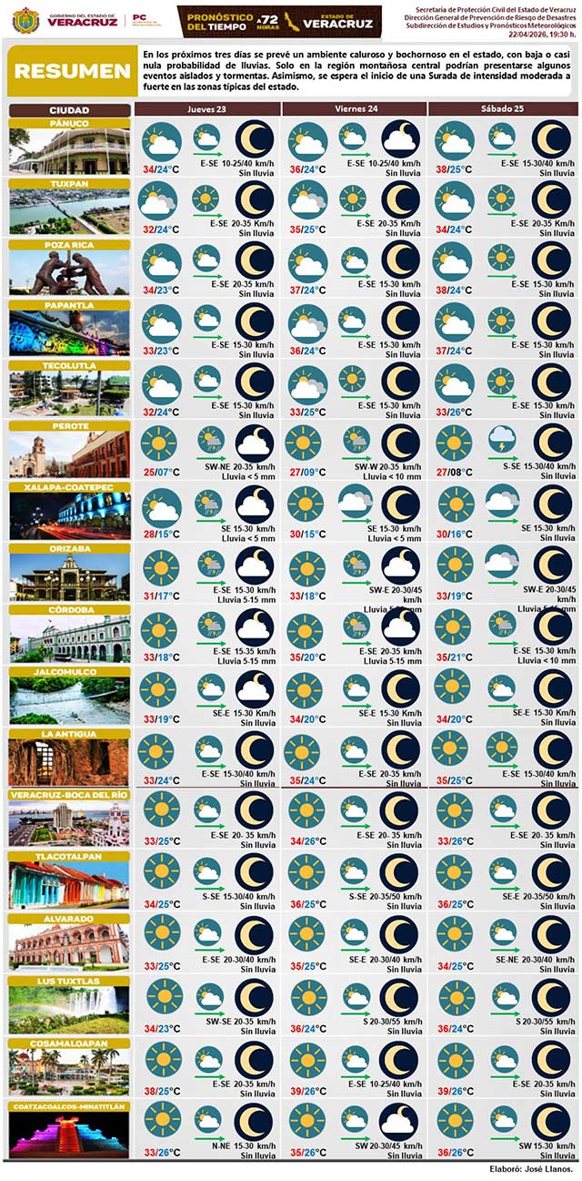 En los próximos 3 días se prevé ambiente caluroso y bochornoso en el estado, con baja o nula probabilidad de lluvias. Sólo en la región montañosa central podrían presentarse algunos eventos aislados y tormentas. Asimismo se espera el inicio de una surada de intensidad moderada a fuerte en zonas típicas de la entidad.