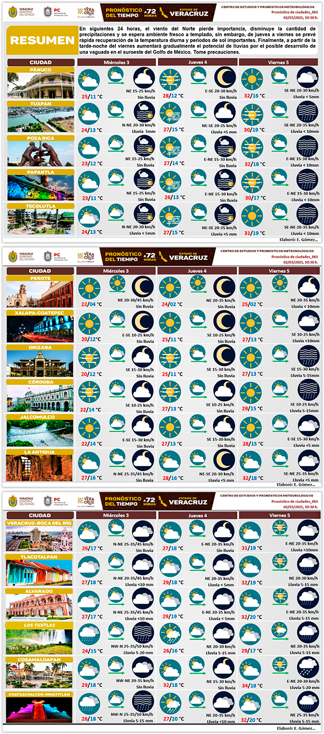 En siguientes 24 horas, el viento del Norte pierde importancia, disminuyen precipitaciones y se espera ambiente fresco a templado. Sin embargo, de jueves a viernes se prevé rápida recuperación de la temperatura diurna y periodos de sol importantes. Finalmente, a partir de la tarde-noche del viernes aumentará gradualmente el potencial de lluvias por el posible desarrollo de una vaguada en el suroeste del Golfo de México. Tome precauciones.