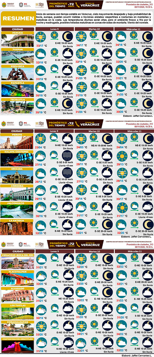 Inicio de semana con tiempo estable en Veracruz, cielo mayormente despejado y baja probabilidad de lluvia, aunque pueden ocurrir nieblas o lloviznas aisladas vespertinas a nocturnas en montañas y matutinas en la costa. Las temperaturas diurnas serán altas pero el ambiente fresco a frío por la noche y madrugada, posibles heladas matutinas en zonas elevadas de montaña. Viento del noreste.