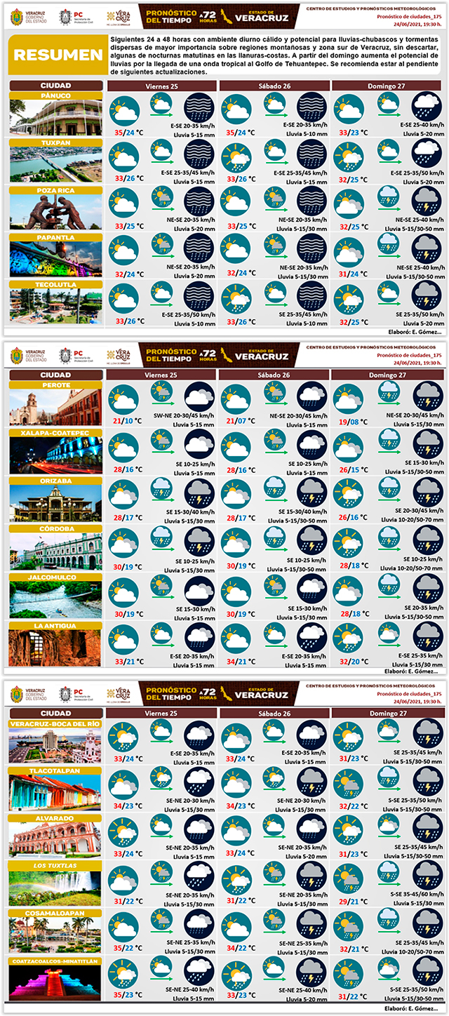 Siguientes 24 a 48 horas con ambiente diurno cálido y potencial para lluvias-chubascos y tormentas dispersas de mayor importancia sobre regiones montañosas y zona sur de Veracruz, sin descartar algunas de nocturnas a matutinas en las llanuras-costas. A partir del domingo aumenta el potencial de lluvias por la llegada de una onda tropical al Golfo de Tehuantepec. Se recomienda estar al pendiente de siguientes actualizaciones.