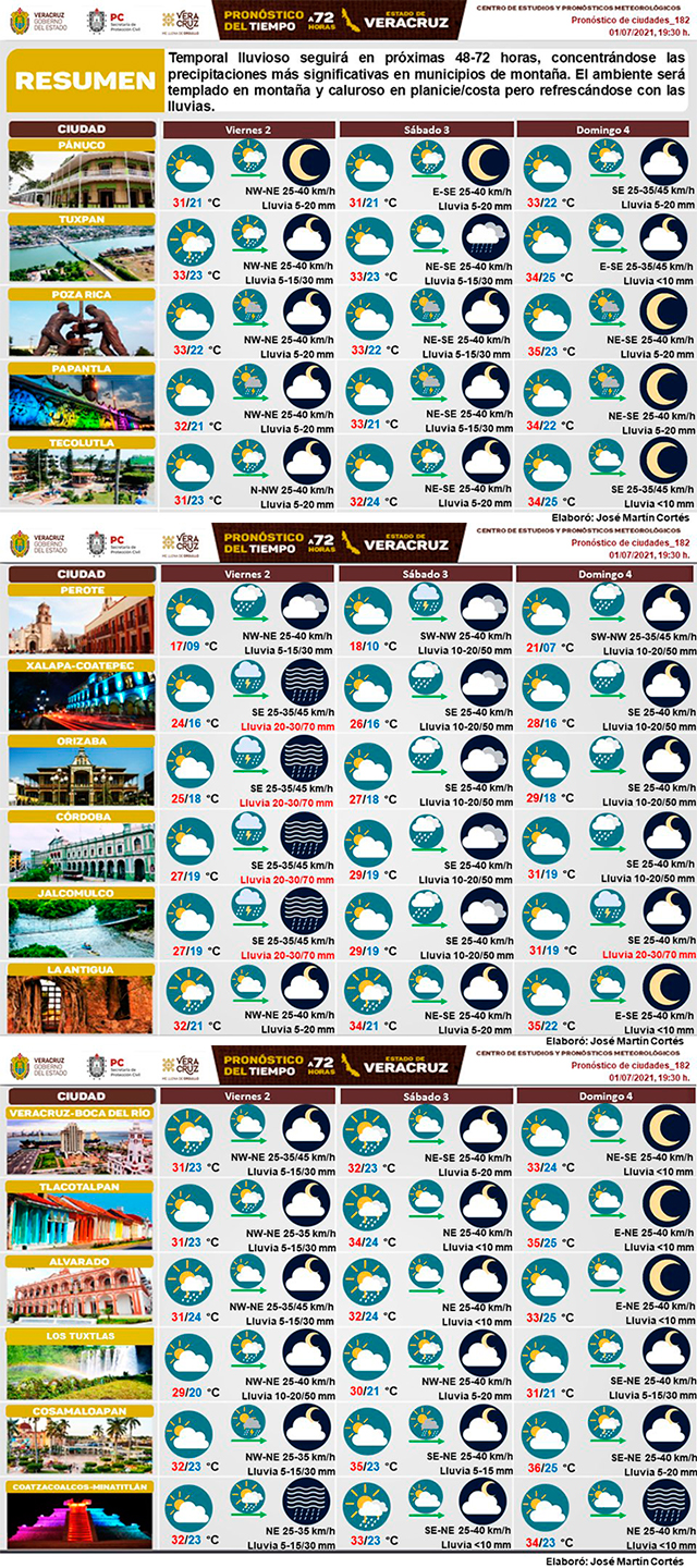 Temporal lluvioso seguirá en próximas 48-72 horas, concentrándose las precipitaciones más significativas en municipios de montaña. El ambiente será templado en montaña y caluroso en planicie/costa pero refrescándose con las lluvias.