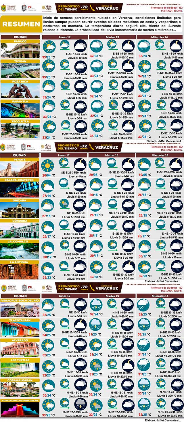 Inicio de semana parcialmente nublado en Veracruz, condiciones limitadas para lluvias aunque pueden ocurrir eventos aislados matutinos en costa y vespertinos a nocturnos en montaña. La temperatura diurna seguirá alta. Viento del Sureste rolando al Noreste. La probabilidad de lluvia incrementaría de martes a miércoles.