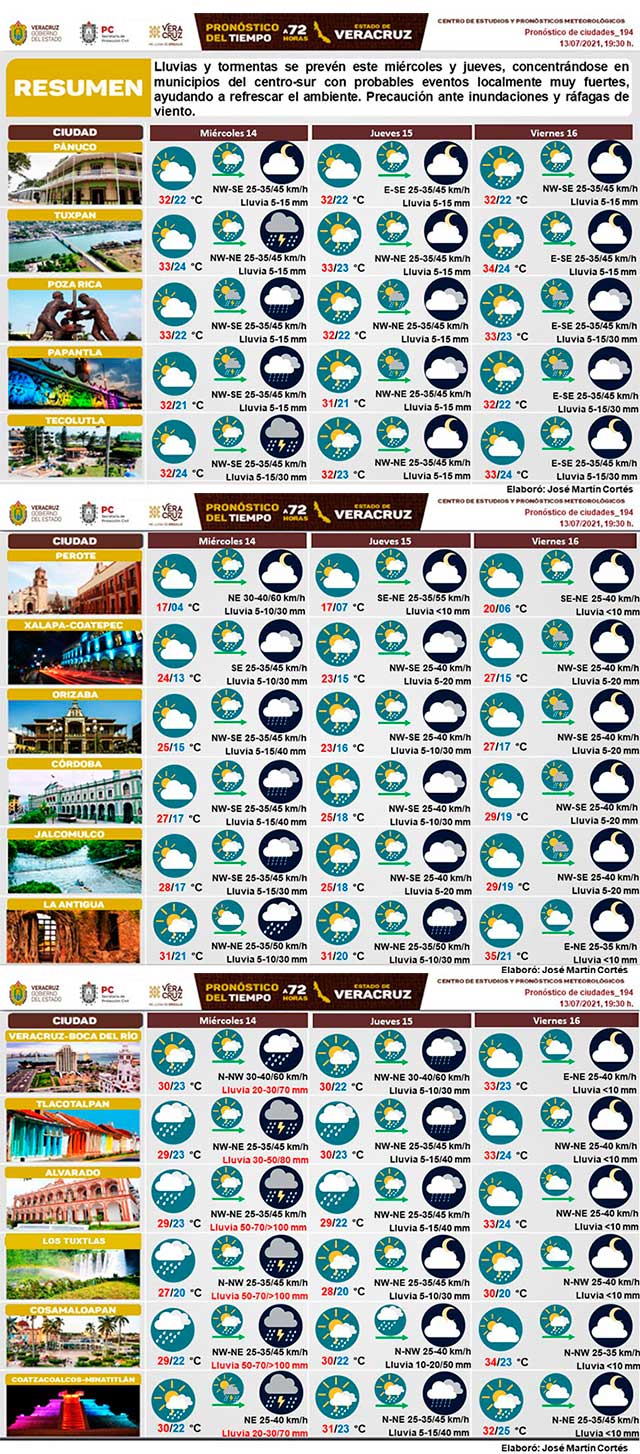 Lluvias y tormentas se prevén este miércoles y jueves, concentrándose en municipios del centro-sur con probables eventos localmente muy fuertes, ayudando a refrescar el ambiente. Precaución ante inundaciones y ráfagas de viento.