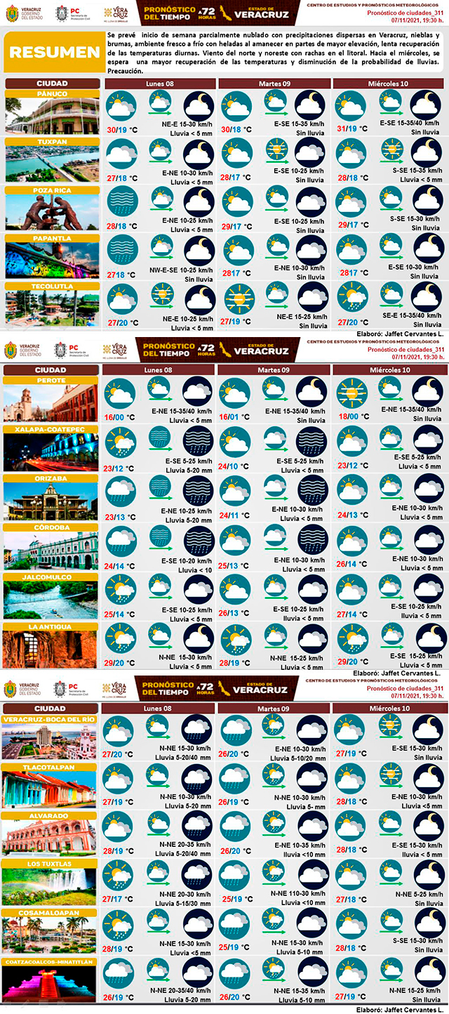 Se espera un inicio de semana parcialmente nublado con precipitaciones dispersas en Veracruz, nieblas y brumas; ambiente frío, heladas al amanecer en montañas.