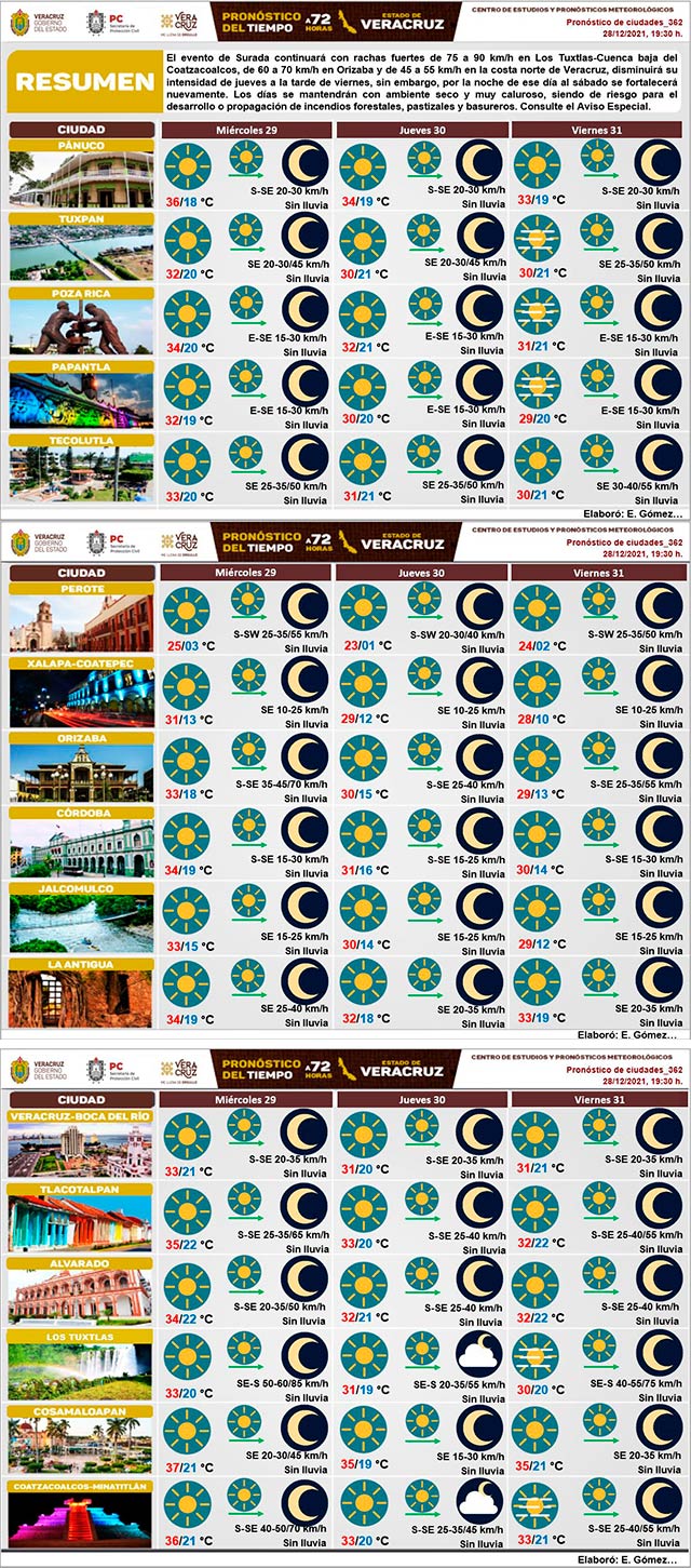 El evento de “surada” continuará con rachas fuertes de 75 a 90 kilómetros por hora en Los Tuxtlas-Cuenca baja del Coatzacoalcos, de 60 a 70 kilómetros por hora en Orizaba y de 45-a 55 kilómetros por hora en la costa norte de Veracruz, disminuirá su intensidad de jueves a la tarde del viernes; sin embargo, por la noche de ese día el sábado se fortalecerá nuevamente. Los días se mantendrán con ambiente seco y muy caluroso, siendo de riesgo para el desarrollo o propagación de incendios forestales, pastizales y basureros. Consulte el aviso especial.