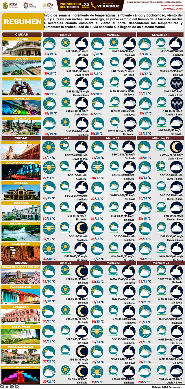 Inicio de semana con incremento de temperaturas, ambiente cálido y bochornoso, viento del sur y sureste con rachas; sin embargo, se prevé cambio del tiempo de la tarde de martes a miércoles, cuando cambiará el viento al norte, descenderán las temperaturas y aumentará la probabilidad de lluvia asociado a la llegada de un sistema frontal.