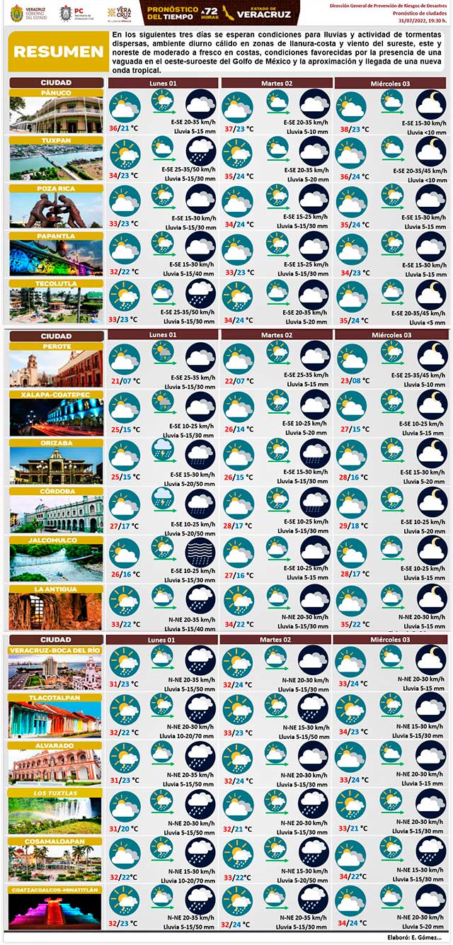 En los siguientes tres días se esperan condiciones para lluvias y actividad de tormentas dispersas, ambiente diurno cálido en zonas de llanura-costa y viento del Sureste, Este y Noreste de moderado a fresco en costas, condiciones favorecidas por la presencia de una vaguada en el Oeste-Suroeste del Golfo de México y la aproximación y llegada de una nueva onda tropical.