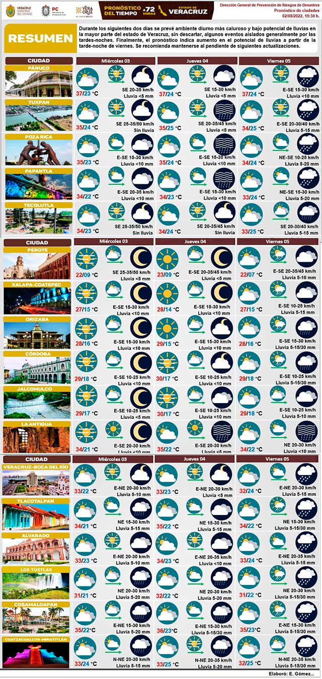 Durante los siguientes dos días se prevé ambiente diurno más caluroso y bajo potencial de lluvias en la mayor parte del Estado de Veracruz, sin descartar algunos eventos aislados generalmente por las tardes-noches. Finalmente, el pronóstico indica aumento en el potencial de lluvias a partir de la tarde-noche del viernes. Se recomienda mantenerse al pendiente de siguientes actualizaciones.