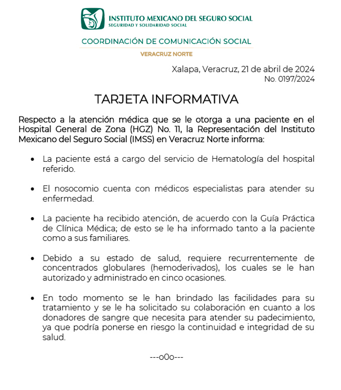 Puntualiza IMSS la atención que se le brinda a paciente en la clínica 11 de Xalapa