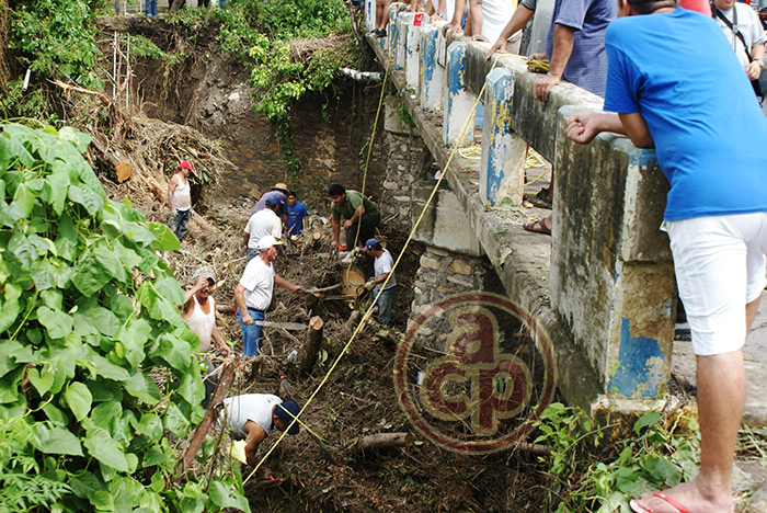 Arroyo Hondo, municipio de Misantla, Ver., 22 de septiembre de 2013.-Vecinos de esta comunidad retiran los enormes árboles que la corriente arrastró y que se convirtieron en un tapón debajo del puente, provocando que el nivel del agua subiera y afectó a varias familias que habitan en la ribera.