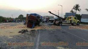La tarde de este lunes se registró la volcadura de una góndola de un tráiler que transportaba maíz en el Puente Caracol, de la colonia Coatzacoalcos, vecinos llegaron a hacer rapiña.