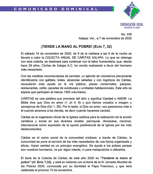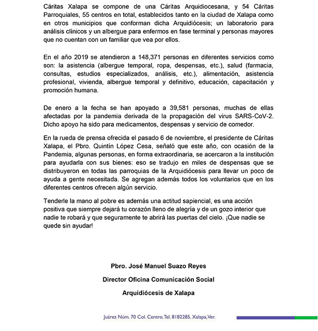 - Arquidiócesis de Xalapa exhorta a ciudadanos a apoyar a los más necesitados