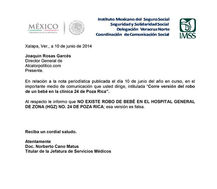 Rechaza Delegación del IMSS-Norte robo de bebé en clínica de Poza Rica