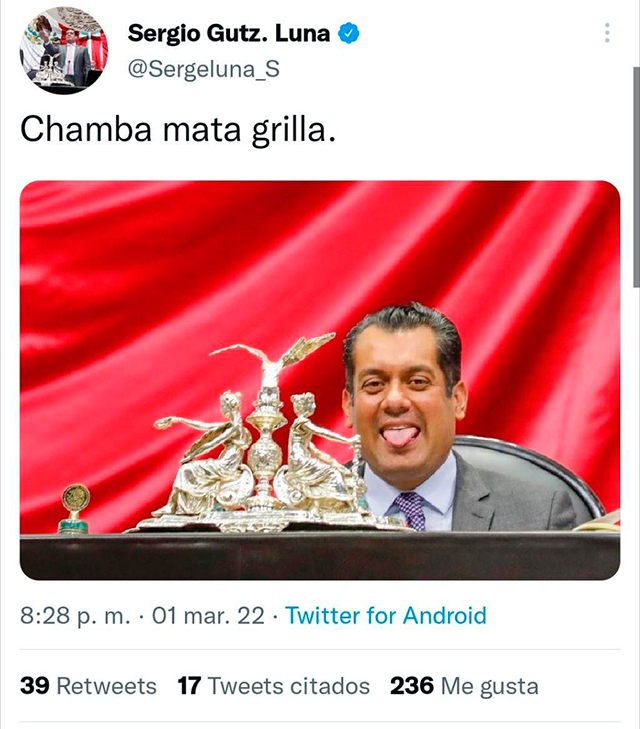 Por su parte, el presidente de la Cámara de Diputados, Sergio Gutiérrez Luna, se limitó a expresar en redes sociales que “Chamba mata grilla”.