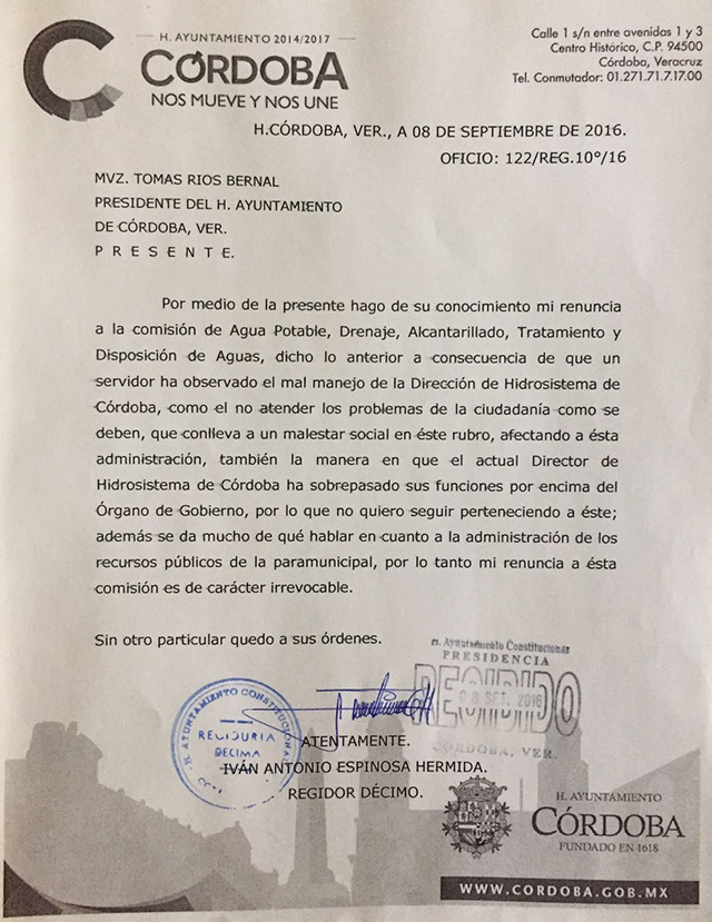 A través del oficio 122/REG.10/16 girado el 8 de septiembre al alcalde Tomás Ríos Bernal, el edil informó su dimisión a las comisiones y destacó que esto se debe a que, además del manejo en el órgano administrador del agua en Córdoba, el titular de esta paramunicipal ha sobrepasado sus funciones por sobre los miembros del Órgano de Gobierno.